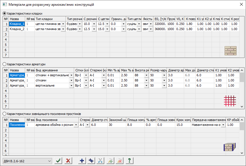 Задання матеріалів для розрахунку армокам'яних конструкцій виконується за звичною схемою, такою як при заданні матеріалів залізобетонних чи металевих конструкцій. Матеріал мурування складається з таких компонентів: характеристики матеріалу кладки, характеристики арматури, характеристики зовнішнього підсилення простінків, і призначається на пластинні елементи, якими моделюються стіни. Якщо задається підсилення (сталева, залізобетонна, армована розчинна обойма), то виконуватиметься тільки перевірка міцності кладки. В рамках однієї задачі користувач має можливість створювати варіанти конструювання. Варіанти можуть відрізнятися нормами розрахунку, типом кладки, видом армування, матеріалами, конфігурацією простінків тощо. Міцність матеріалу кладки з цегли, каменів, блоків визначається за заданим класом чи маркою, враховується тип, марка розчину та інші параметри.