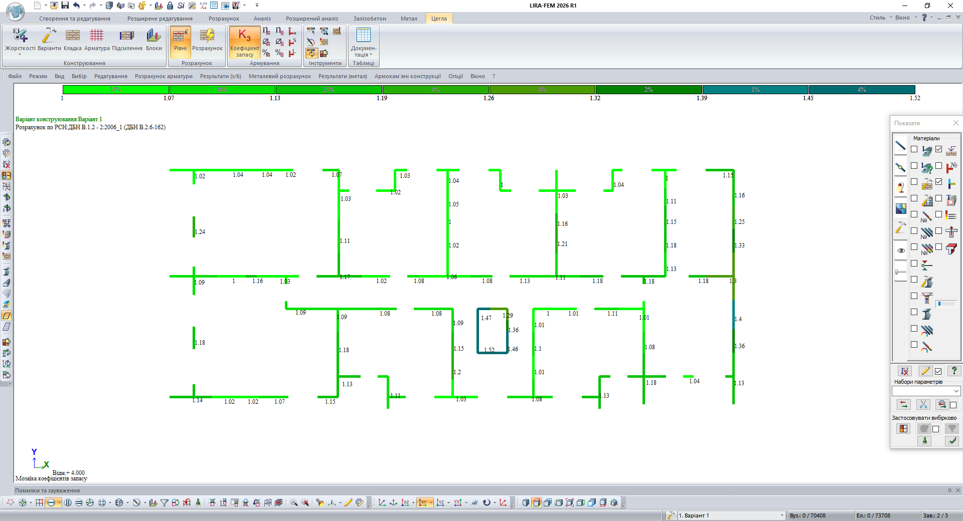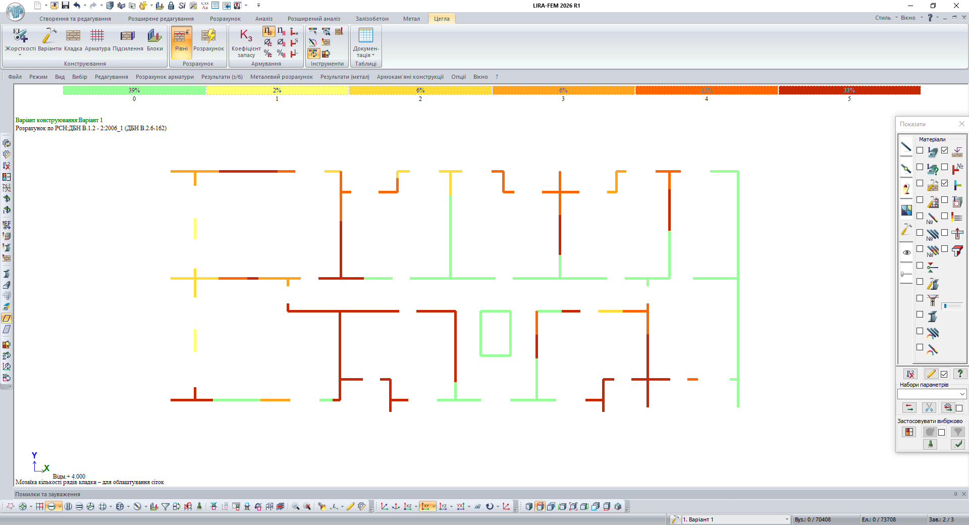 За результатами розрахунку кладки у випадку армування сітками формуються мозаїки кількості рядів кладки, через яку необхідно вкладати сітки, мозаїки діаметрів арматури сіток, мозаїки відсотків армування простінків сітками. Якщо для розрахунку був обраний варіант армування вертикальними стержнями або комбінований варіант (сітки та вертикальні стержні), то для простінків в кожному розрахунковому рівні представлені мозаїки необхідної кількості вертикальних стержнів, мозаїки діаметрів вертикальних стержнів, мозаїки відповідних відсотків вертикального армування простінків. З врахуванням підібранної арматури обчислюються коефіцієнти запасу міцності. Для окремих простінків можна отримати повну інформацію про нормативну та розрахункову міцність кладки, наводяться розрахункові параметри. Результати розрахунку оформлюються у вигляді таблиць.
