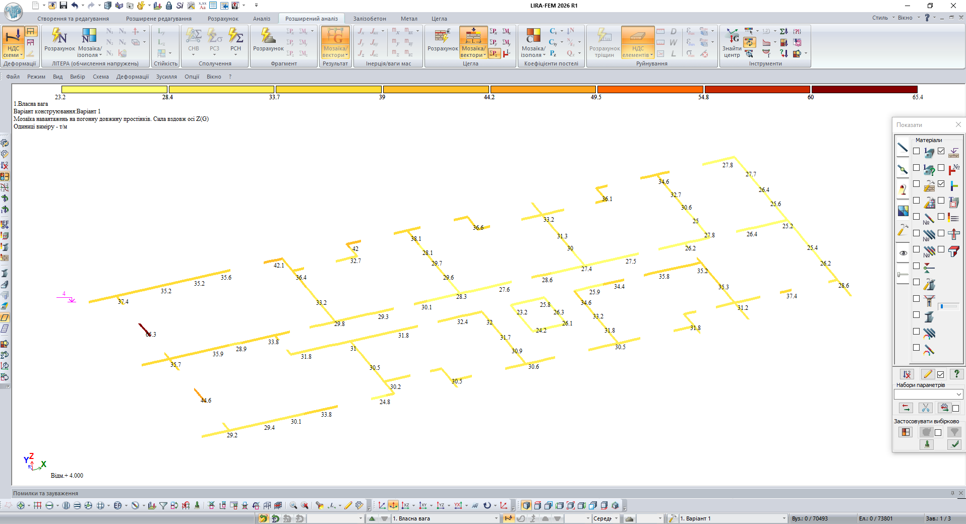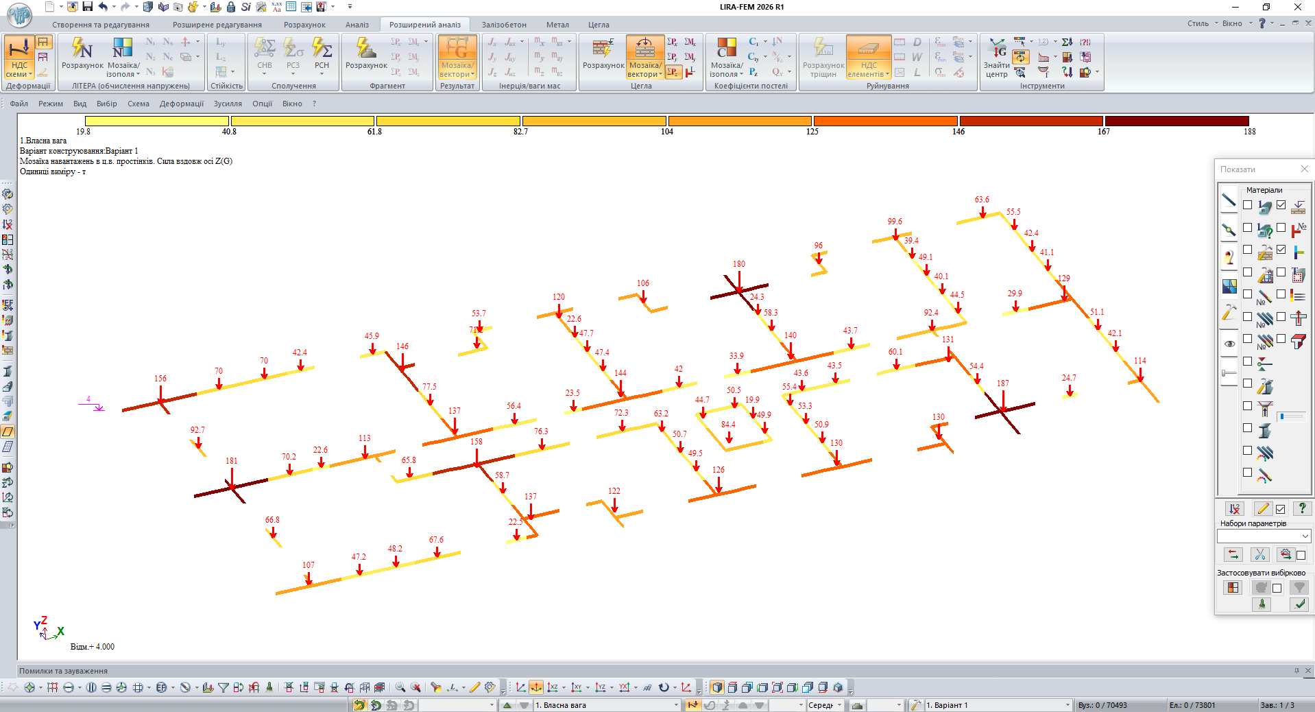 Мозаїки обчислених навантажень на простінки формуються як для окремих завантажень, так і для комбінацій розрахункових сполучень зусиль або навантажень. Крім мозаїк, навантаження на простінки можна представити у вигляді векторів, прикладених у центрі ваги кожного простінка, побудувати мозаїку погонних навантажень на простінки. Розглядаються складові навантажень Px, Py, Pz, Mx, My.