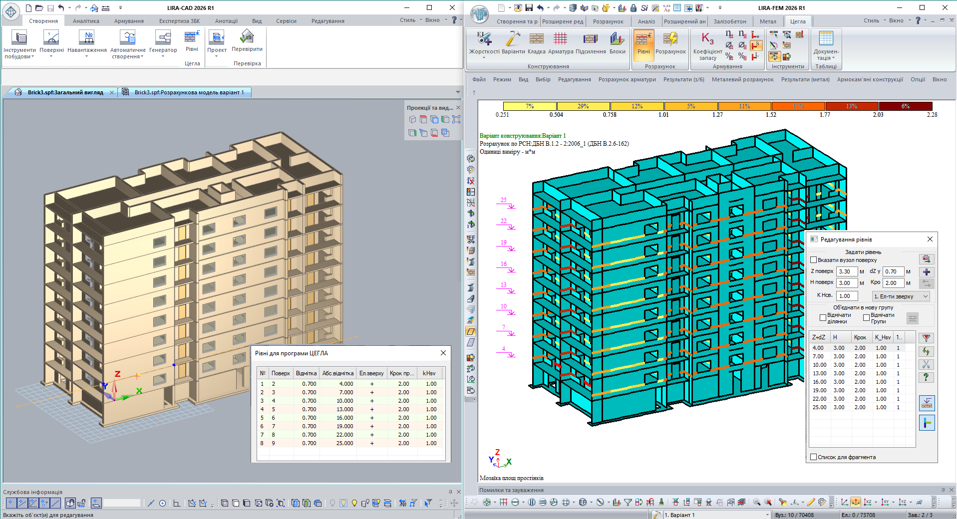 Розрахункова схема будівлі створюється у графічному середовищі ВІЗОР, а при використанні повного технологічного ланцюжка проєктування (коли модель будівлі формується в LIRA-CAD) – в LIRA-CAD, КОНСТРУКЦІЇ. Користувач на етапі моделювання призначає за висотою будівлі потрібну кількість горизонтальних розрахункових рівнів армокам'яної кладки, в яких виконуватиметься перевірка її міцності (як правило, це рівні найменшого перерізу простінків, рівні спирання плит перекриттів тощо). При обчисленні зусиль модулем МСЕ розрахунку враховується спільна просторова робота несних мурованих та залізобетонних елементів будівлі. Для кожного рівня автоматично визначається конфігурація розрахункових перерізів простінків. Ділянки стін можуть довільно перерозподілятися корисувачем в межах сусідніх простінків, об'єднуватися в складні перерізи (кут, хрест, несиметричний тавр та більш складні) або, навпаки, розділятися. Навантаження на змінені простінки автоматично перераховуються за наявними результатами розрахунку. В процесі розрахунку кладки для кожного простінка визначається необхідна кількість арматурних сіток, за потреби виконується підбір стержнів вертикального армування.