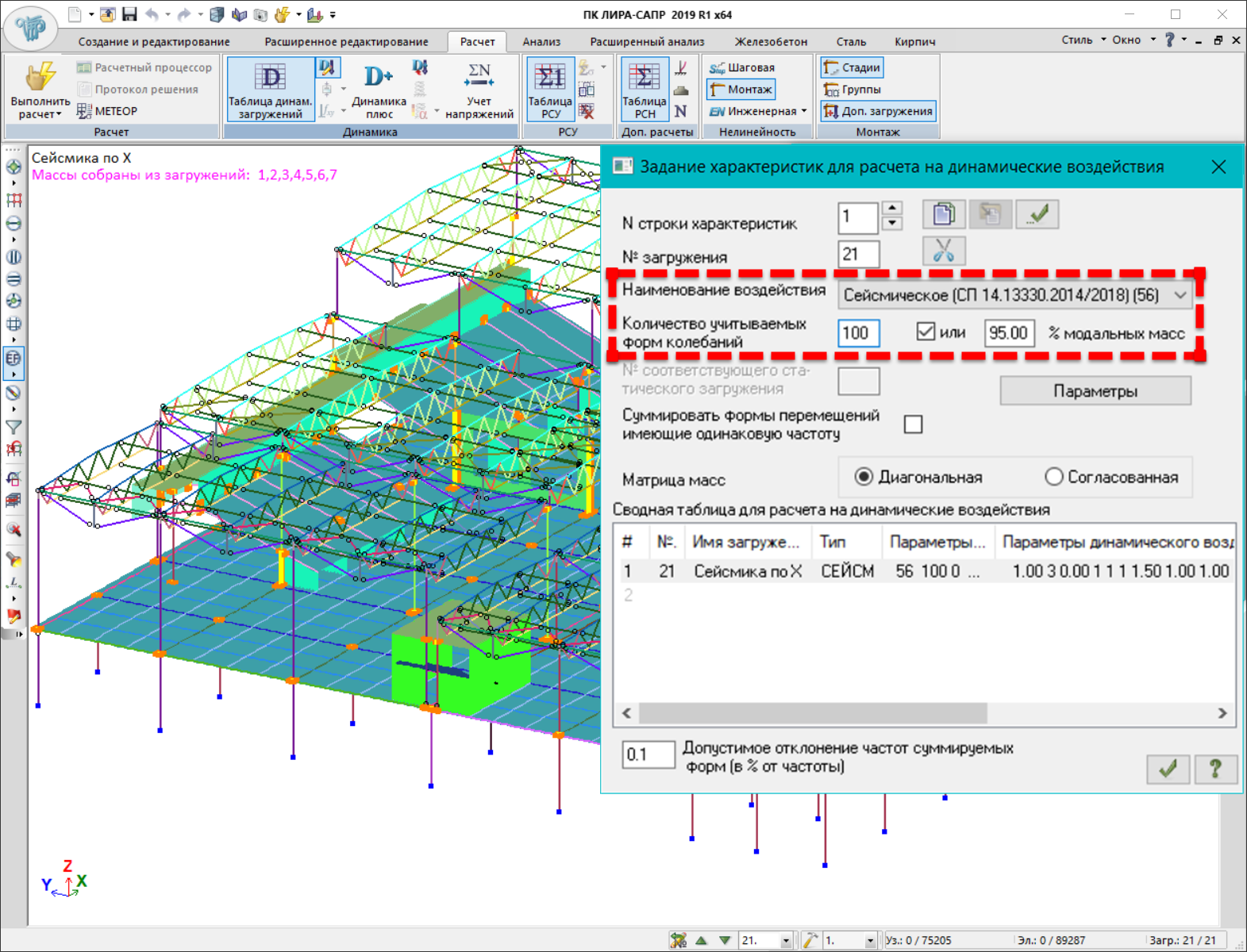 - Реалізована можливість задавати в параметрах розрахунку на сейсмічні навантаження сумарний відсоток модальних мас, який повинен бути накопичений, а в параметрах розрахунку на вітер з урахуванням пульсації - ознака необхідності досягнення граничної частоти. Обчислення власних коливань тепер припиняється, якщо набрано задану кількість форм або виконані вищеописані умови, в залежності від того що настане раніше. Як кількість форм можна задати дуже велике число, щоб воно було фактично проігнороване як критерій зупинки обчислення власних коливань.