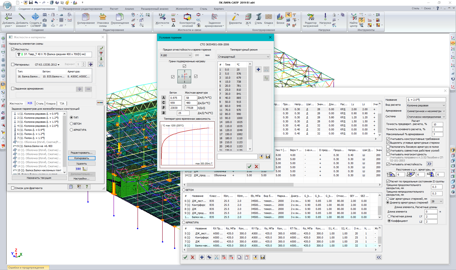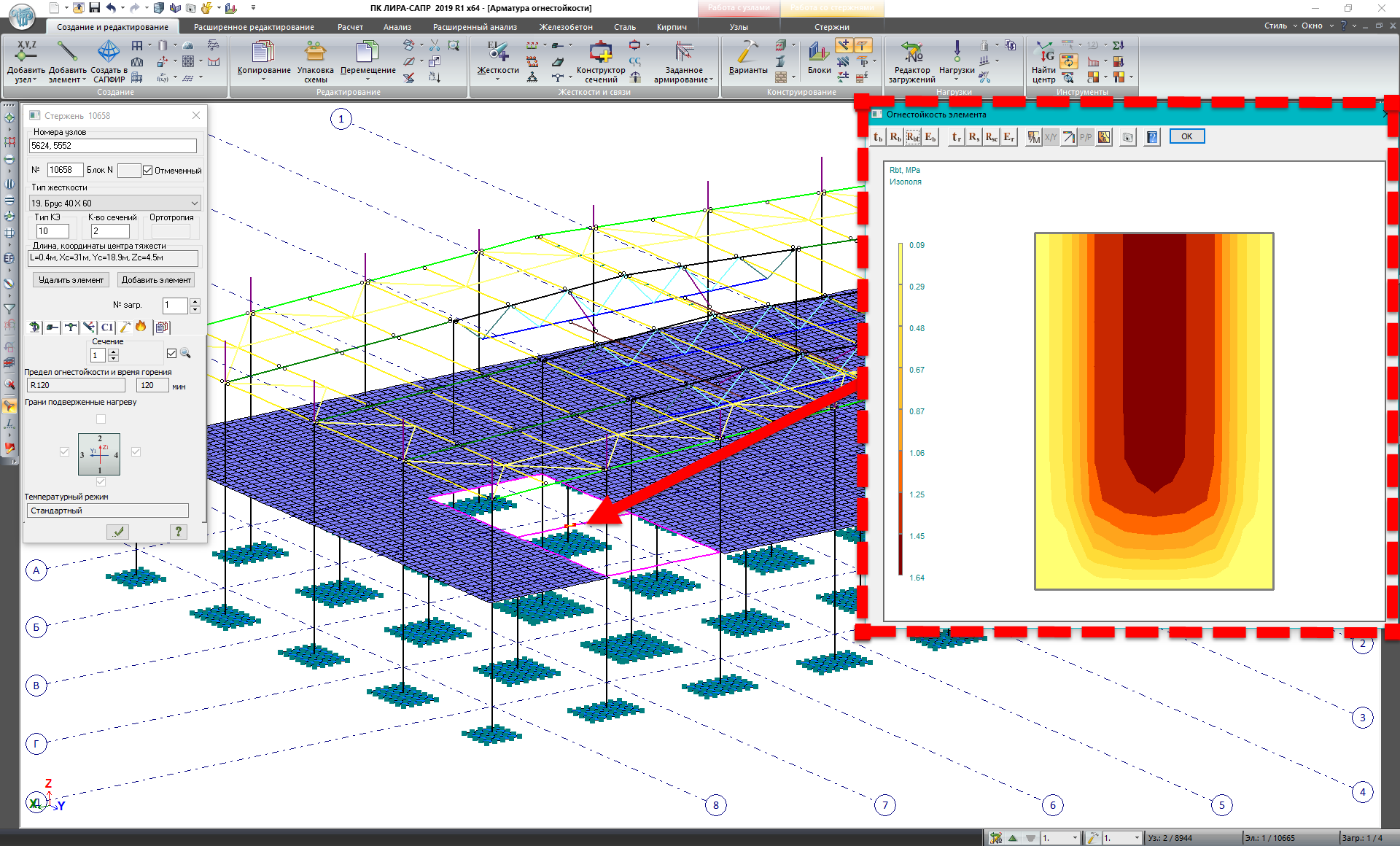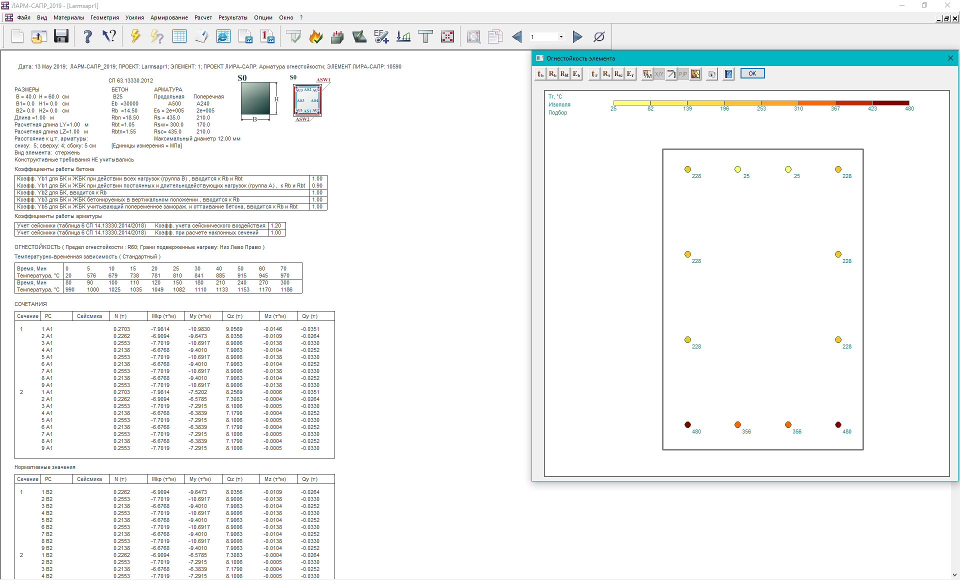 - Реалізовано алгоритм підбору армування для забезпечення необхідної межі вогнестійкості на підставі положень, викладених у СТО 36554501-006-2006 з використанням нелінійно-деформаційної теорії. Розв'язання даної задачі зводиться до обчислення розподілу температур по перерізу, відповідно до заданого періоду часу в умовах пожежі; подальшим коригуванням фізико-механічних характеристик матеріалів на підставі отриманих температурних полів; перевірці несучої здатності елементів конструкції на дію нормативного навантаження та у разі невиконання вимог – нарощування армування. Розрахунок вогнестійкості реалізований для стандартних типів перерізів (прямокутник, кільце, тавр, двотавр, …), сталезалізобетонних (прямокутний бетонний переріз з різними варіантами розташування жорсткої арматури та різні трубобетонні перерізи) та пластинчастих елементів.