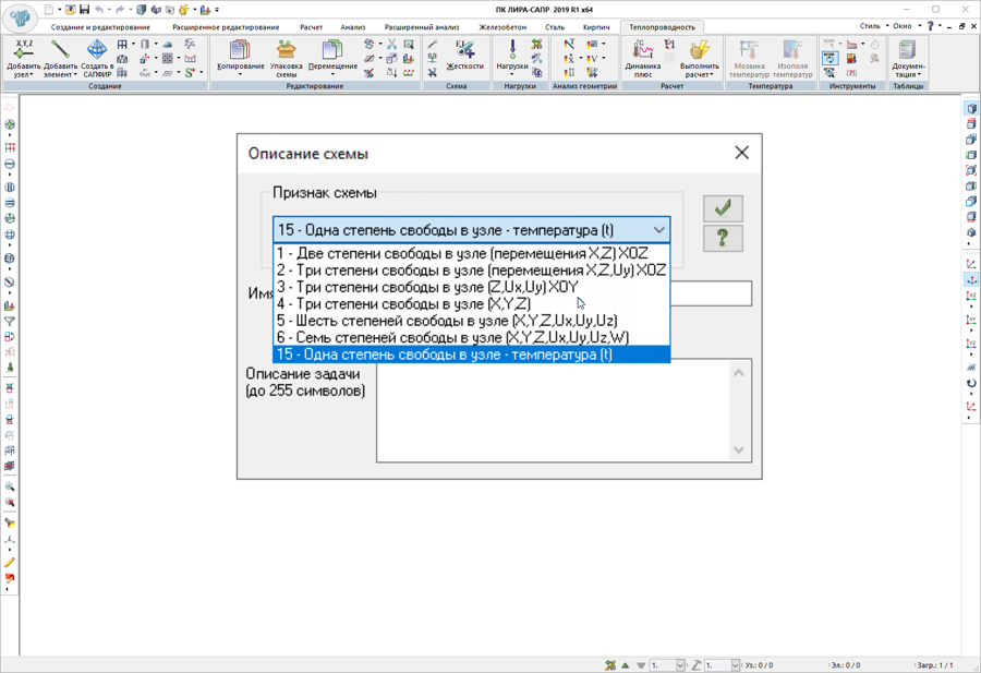 - Реалізовано можливість моделювання стаціонарних та нестаціонарних процесів теплообміну. Для вирішення задач теплопровідності створено нову ознаку схеми (15). У цьому випадку вузли розрахункової схеми мають один ступінь свободи – температуру t.