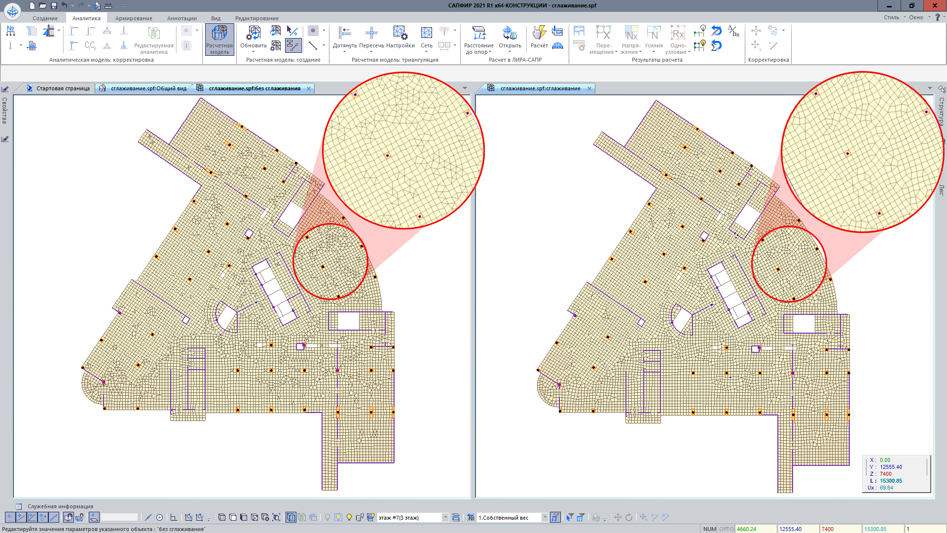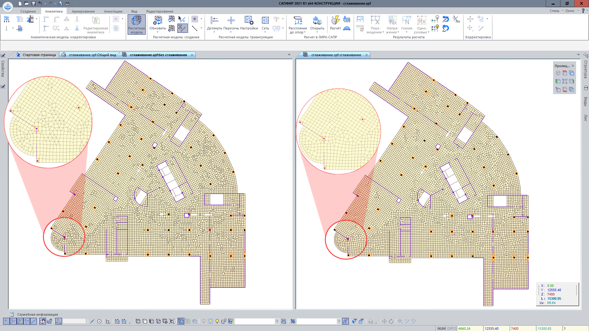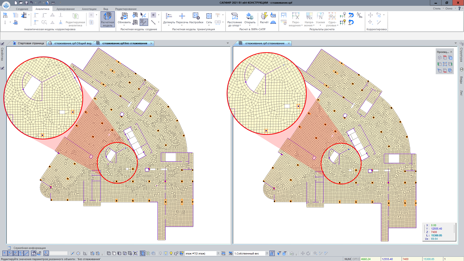 • Реализована возможность подбора/проверки армирования в пластинчатых элементах, для которых вычислены напряжения не только в центре тяжести, но и в узлах. Необходимо отметить, что при сгущении сети КЭ разница результатов уменьшается.