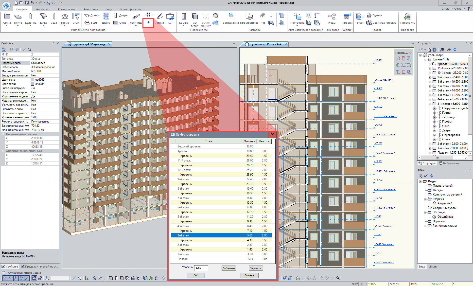 - Розроблено інструмент задання проміжних рівнів у поверхах. Передбачена можливість задати прив'язку об'єктів (стін, плит, колон, балок, дахів і просторів) до рівнів (верху, низу поверху, проміжних). Виконується відображення рівнів на розрізах. При редагуванні позначки рівня автоматично коригуються позначки об'єктів, прив'язаних до цих рівнів.