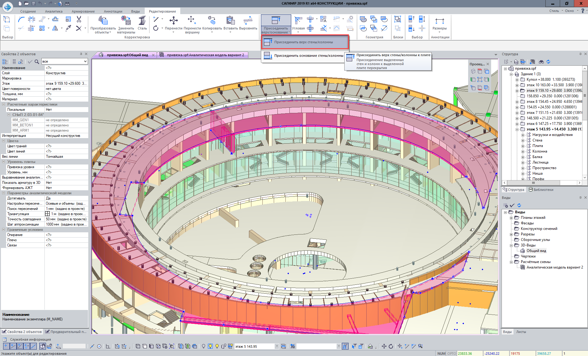 - Додані команди прив'язки вертикальних об'єктів (колон, стін) до плити перекриття. При зміні рівня плити перекриття змінюється висота вертикальних об'єктів.