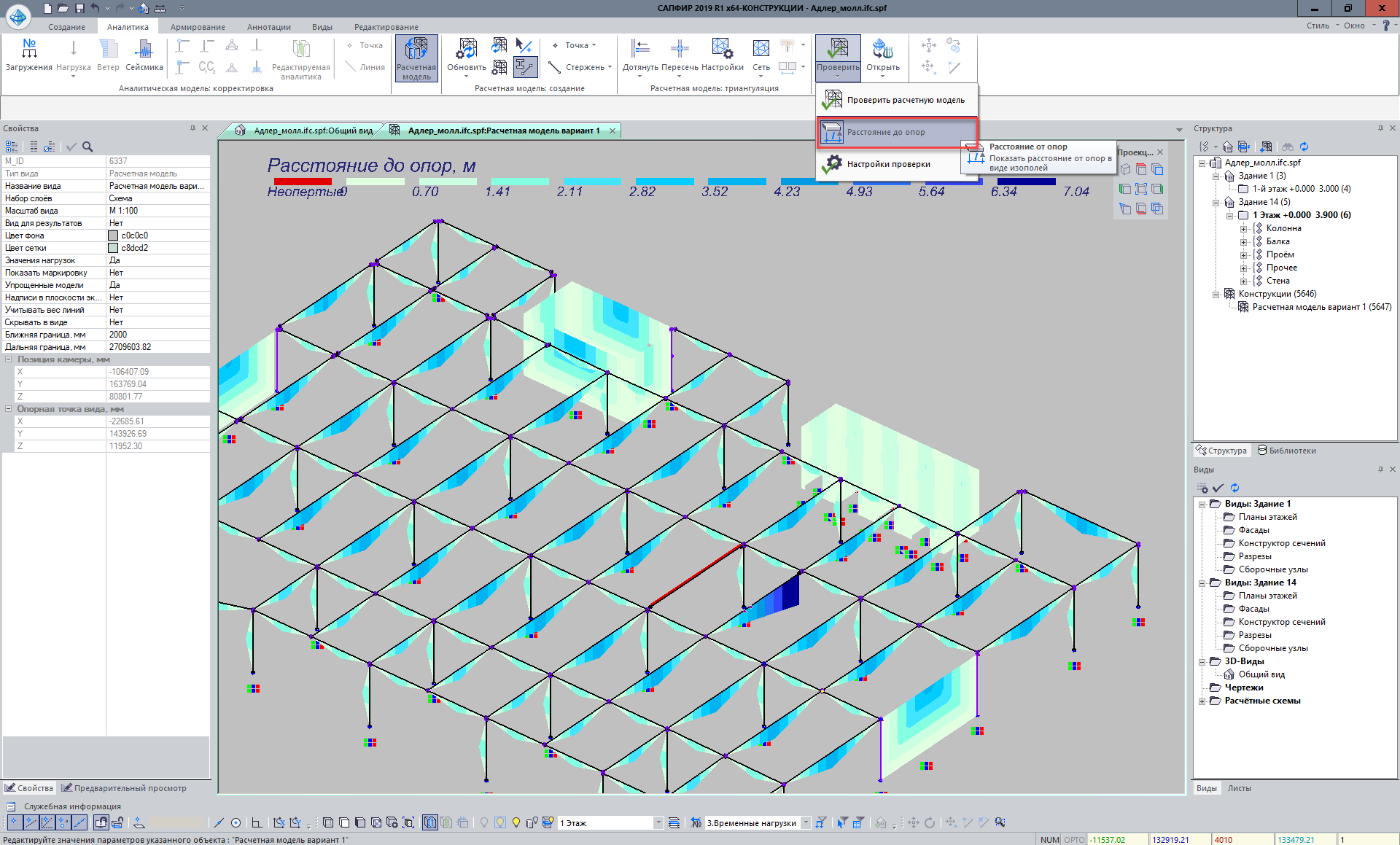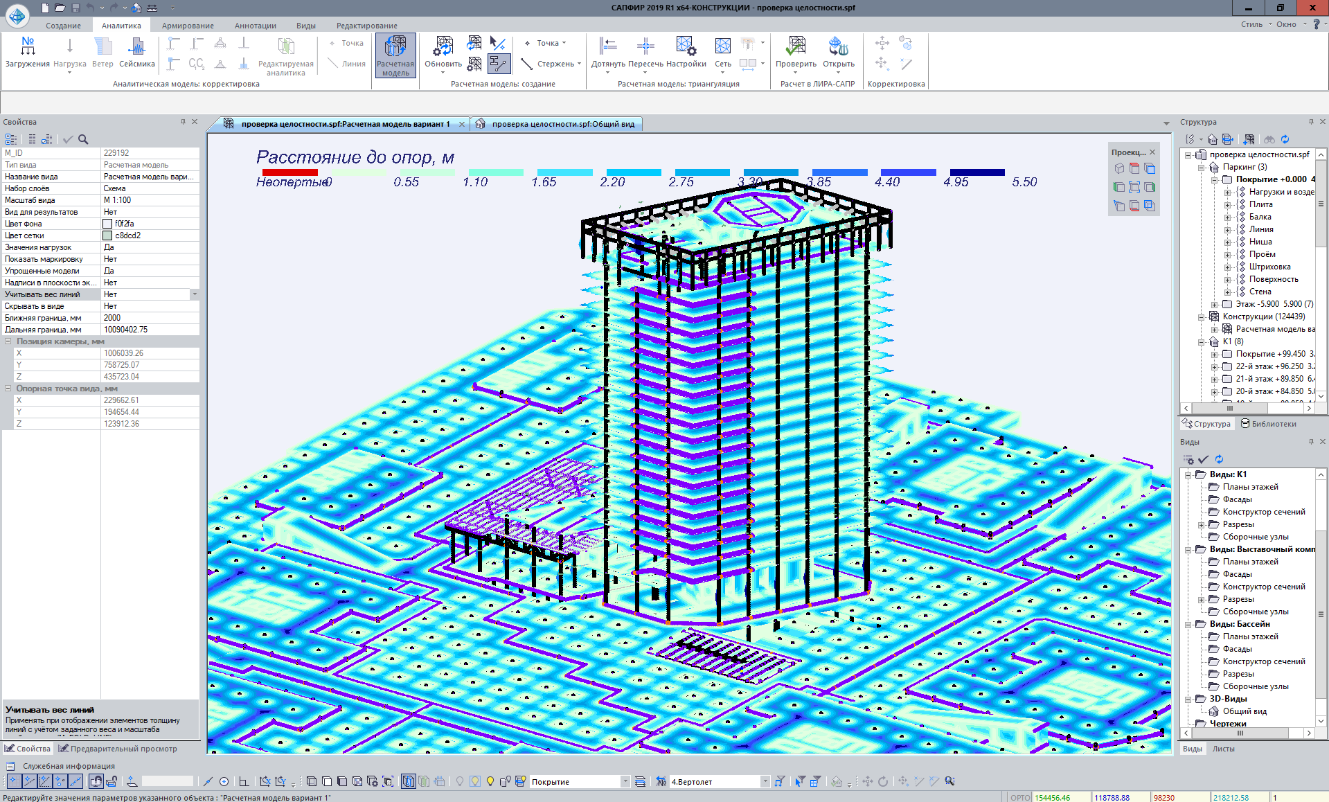 - Запропоновано інструмент для наочної перевірки цілісності розрахункової моделі. На зображенні моделі виконується відрисовка ізополей відстаней до опор та індикація елементів без опори.