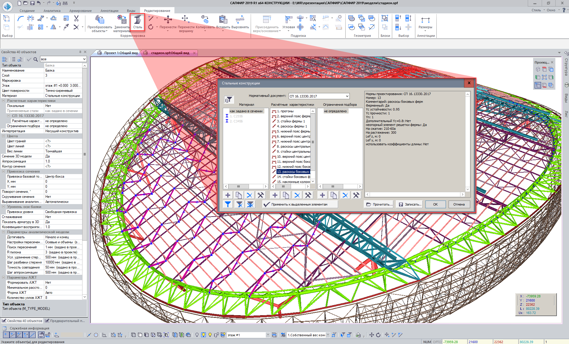 - Реалізовано управління розрахунковими характеристиками сталевих конструкцій в середовищі САПФІР. Можна задати класи сталі, додаткові розрахункові характеристики колон і балок, обмеження підбору перерізів. Параметричний фільтр відстежує ці параметри для вибору елементів сталевих конструкцій. При передачі даних у ВІЗОР-САПР автоматично формуються конструктивні елементи і умовні розкріплення для визначення прогинів.