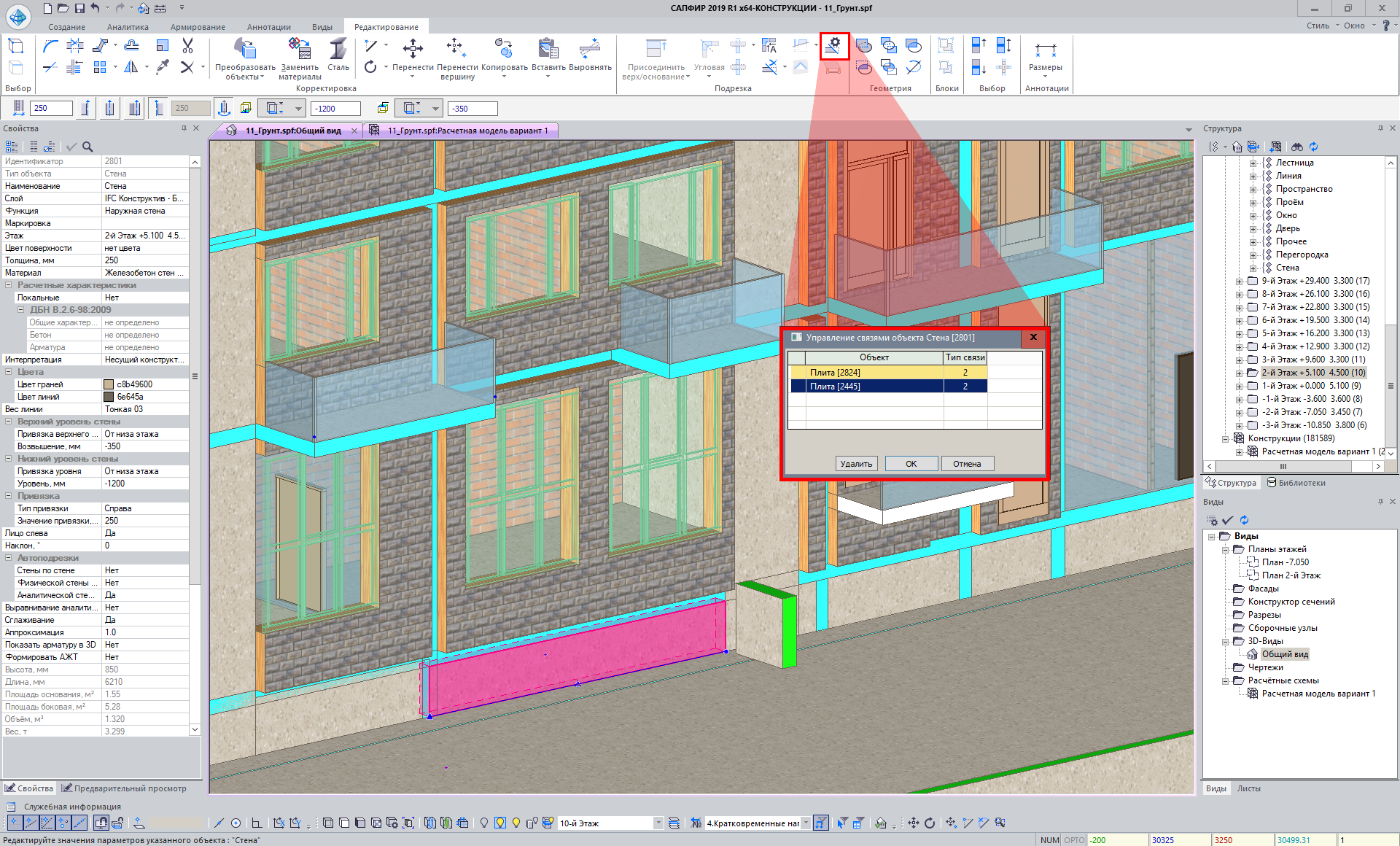 - Створено інструмент Управління підрізками, який відображає які саме об'єкти (плити, стіни, балки) підрізають виділений об'єкт. А також дозволяє виконати скасування цих підрізок.