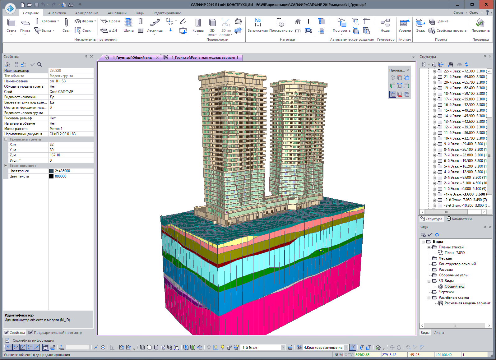 - Реалізовано підключення оновлюваної моделі ґрунту. У САПФІР виконується взаємна прив'язка моделей будівлі і ґрунту. Модель ґрунту з прив'язкою автоматично передається у ВІЗОР-САПР. Є можливість тимчасово приховати окремі шари ґрунту, виконати умовний «розріз» ґрунту за допомогою куба відсікання. Виконується оновлення моделі ґрунту з урахуванням змін, внесених засобами системи ҐРУНТ, зі збереженням заданої прив'язки.
