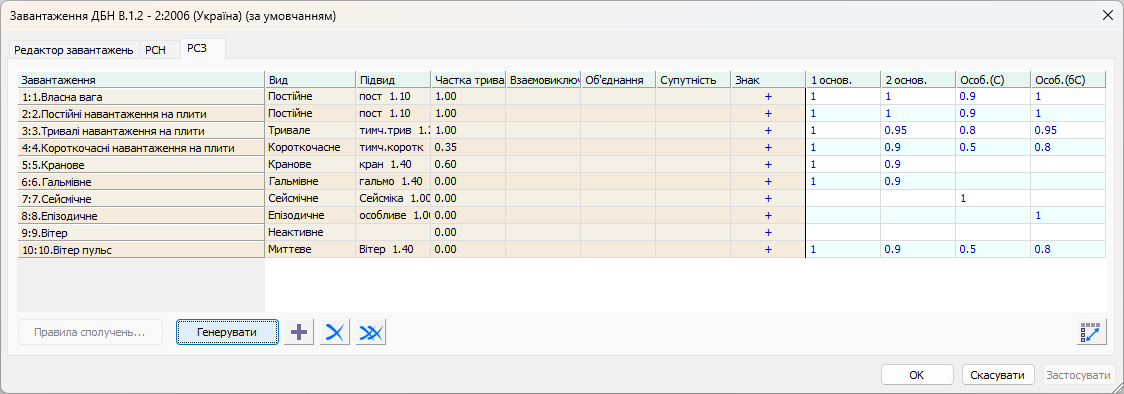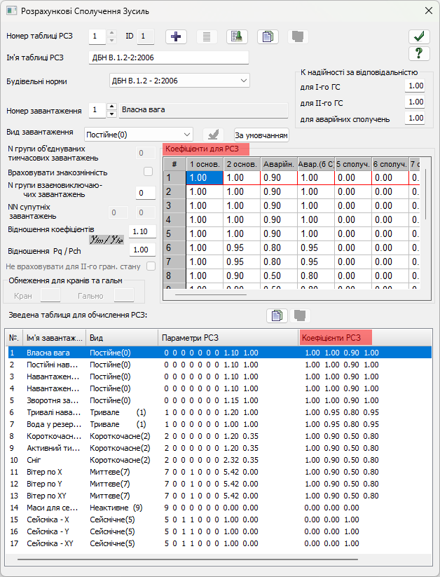 Стовпчики коефіцієнтів сполучень в таблиці РСЗ чи РСН (ДБН В.1.2-2:2006) заповнюються формулами наведеними в таблиці вище. Щоб задати сполучення відповідно запропонованих формул сполучень потрібно зі списку вибрати групу сполучень (1 основне, 2 основне, Аварійне С, Аварійне б/С). В таблицю РСН будуть додані один чи декілька стовпчиків РСН. Наявність в якомусь рядку таблиці ознаки знакозмінності автоматично створює додатковий стовпчик коефіцієнтів сполучень. Наявність груп взаємовиключень також автоматично створює стовпчики коефіцієнтів. Їхня кількість залежить від того, скільки завантажень увійшло в групу взаємовиключення. Кількість стовпчиків збільшується відповідно до правил комбінаторики.