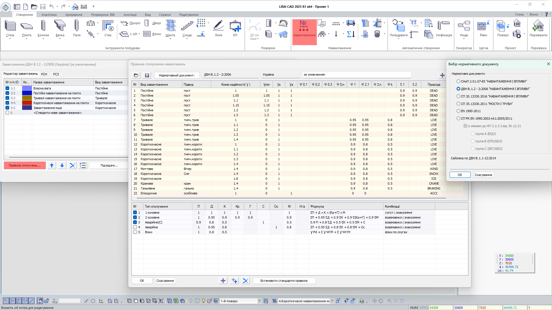 У LIRA-FEM* реалізовано вимоги будівельних нормативних документів багатьох країн, у тому числі комплекту українських стандартів ДБН (Державні будівельні норми).