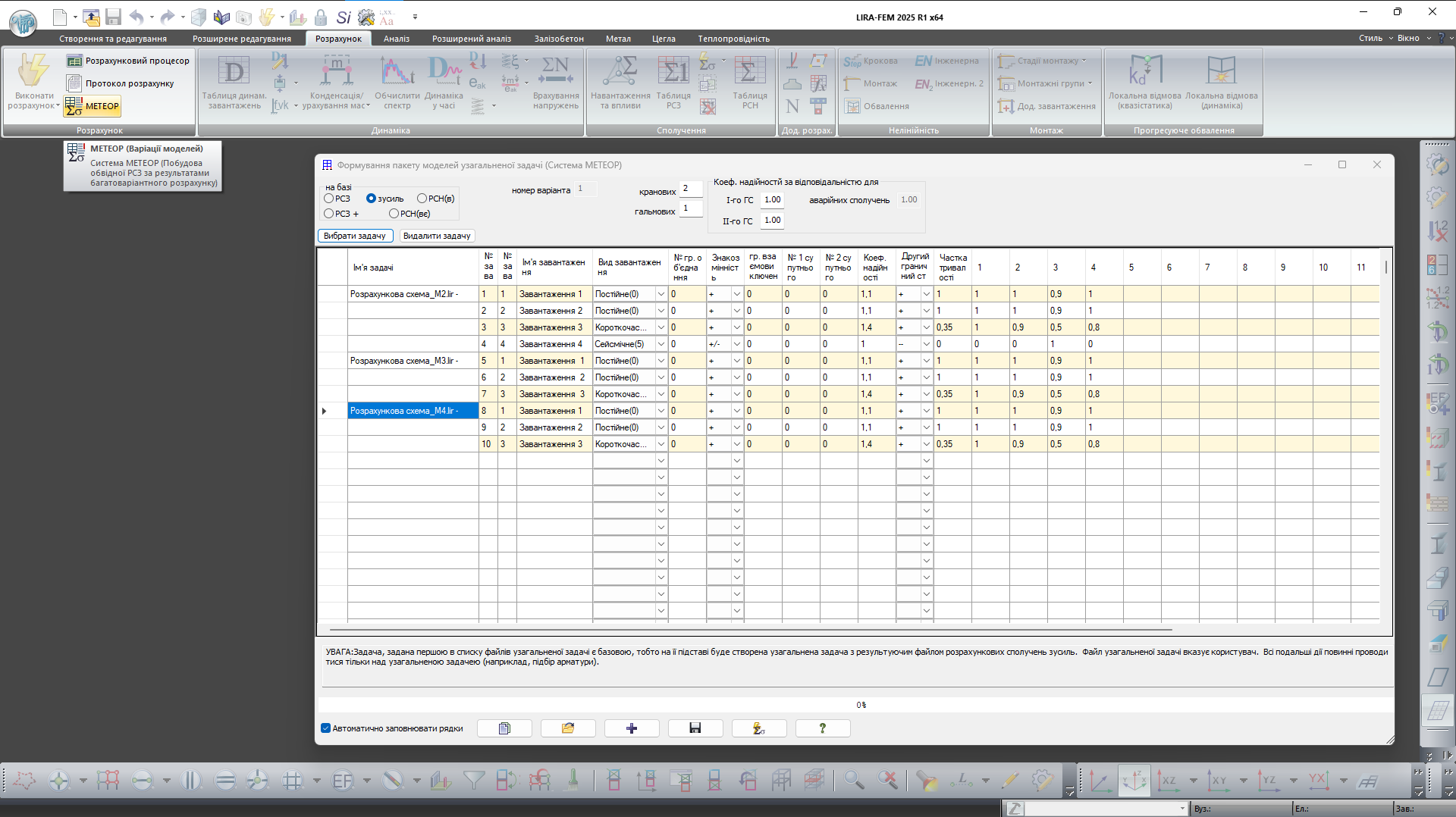 Для норм ДБН В.1.2-2:2006 реалізовано можливість використання системи “МЕТЕОР” (метод єдиного узагальненого результату), яка призначена для об'єднання результатів розрахунку декількох розрахункових схем з однаковою топологією в єдиний узагальнений результат. Однакова топологія розрахункових схем передбачає однакову геометрію, однакову кількість та однакові типи елементів. При цьому розрахункові схеми можуть мати різні граничні умови, в'язі, жорсткісні характеристики, параметри ґрунтової основи, статичні та динамічні завантаження тощо.