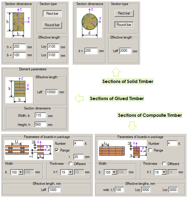 - Розміри поперечного перерізу. Для цільного перерізу – ширина b та висота h прямокутного перерізу або діаметр d круглого перерізу. Для клеєного перерізу – ширина b та висота h прямокутного перерізу. Розміри складеного перерізу визначаються кількістю та параметрами дощок у пакеті – шириною b поперечного перерізу та товщиною hi дощок у пакеті. Товщина задається різною для кожної дошки або однаковою для всіх дощок пакету. При наявності прокладок між дошками пакета – товщина прокладок t.