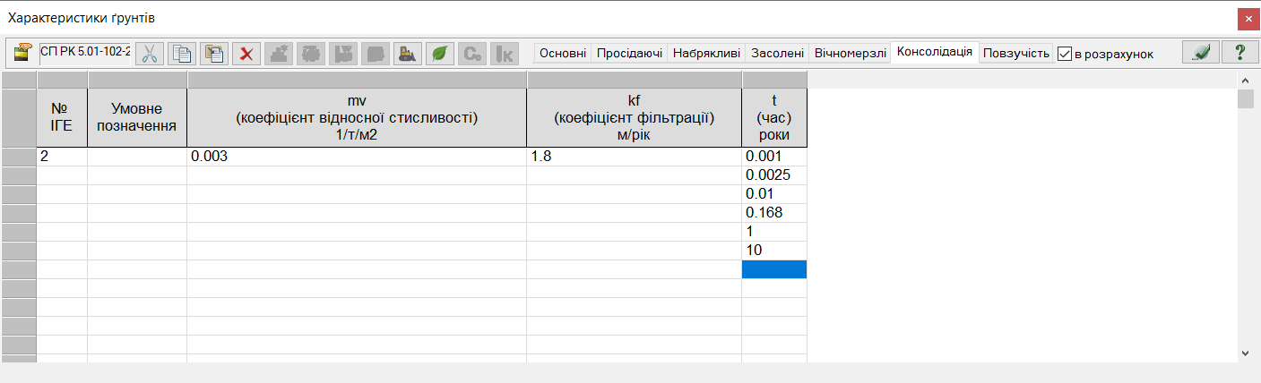 Для визначення опадки консолідації певного шару ІГЕ необхідно задати відповідні характеристики у діалоговому вікні «Характеристики ґрунтів», при переході на вкладку «Консолідація». У таблиці характеристик ґрунтів необхідно задати такі параметри: