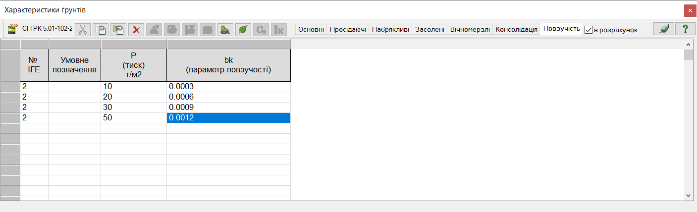 Для визначення опадки повзучості торф'яного покладу необхідно задати відповідні характеристики в діалоговому вікні «Характеристики ґрунтів», при переході на вкладку «Повзучість». У таблиці параметрів ґрунтів необхідно задати наступні параметри:
